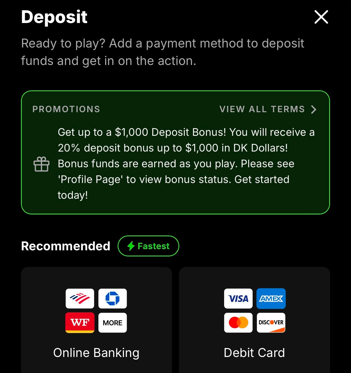 When you sign up on DraftKings, the first action they want you to take is to deposit money, for which they offer a 20% bonus reward: