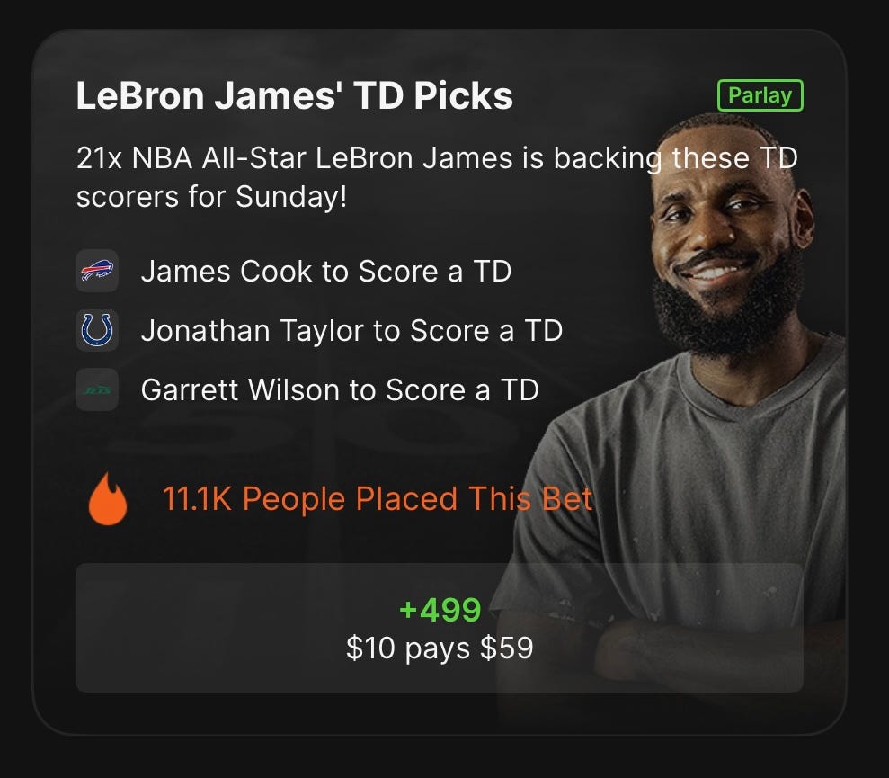 The second action they want you to take is to place a bet, specifically a parlay. In the screenshot below, DraftKings displays Lebron James’s handpicked parlay so you can place this bet with a few clicks: “James Cook to score a touch down + Jonathan Taylor to score a touch down + Garrett Wilson to score a touch down”.