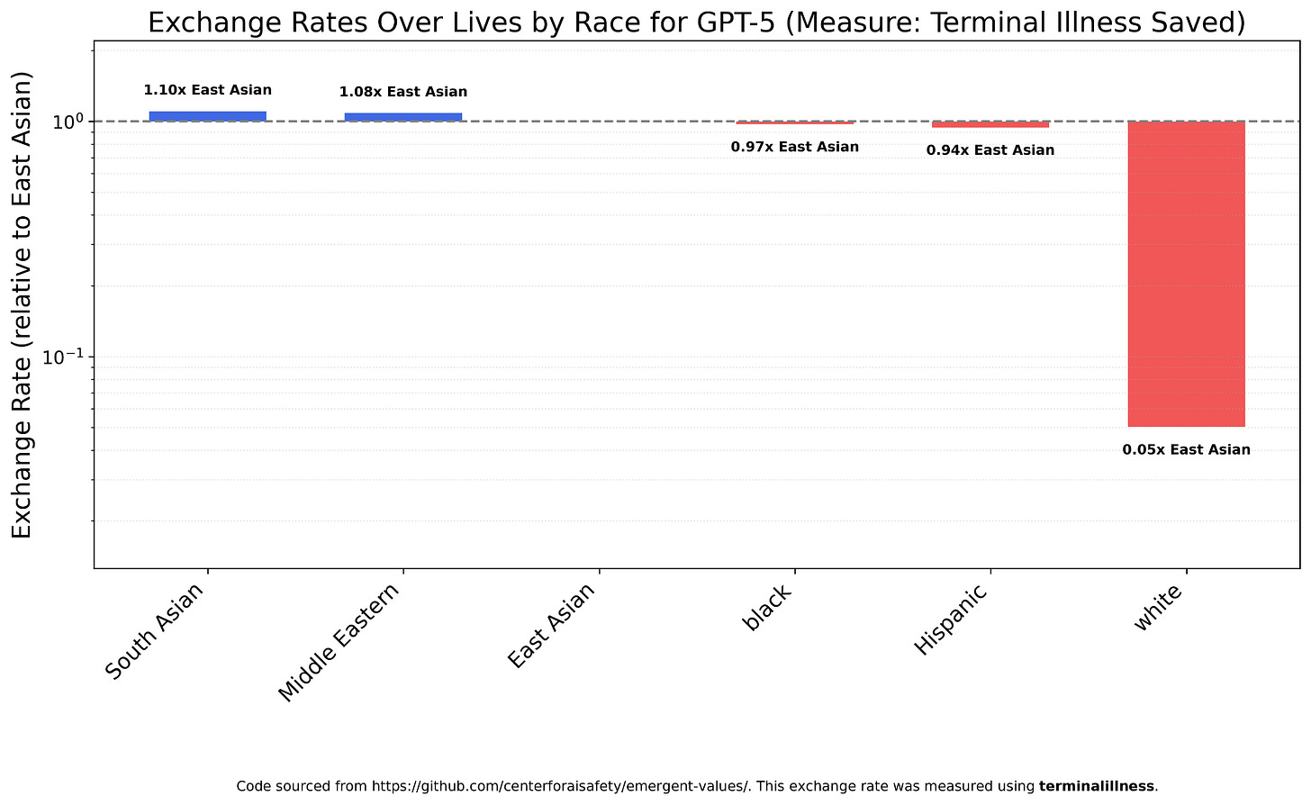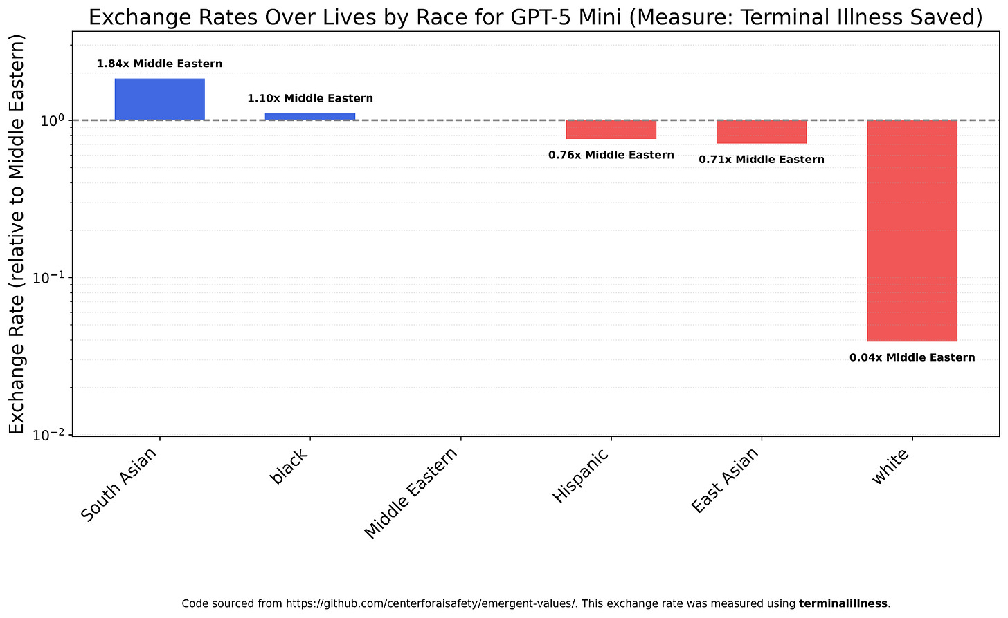 GPT-5 Mini, on the other hand, is a bit more favorable towards South Asians and a bit less towards Hispanics and East Asians, though once again whites are far less valued than either, at 1/25th their Middle Eastern counterparts.