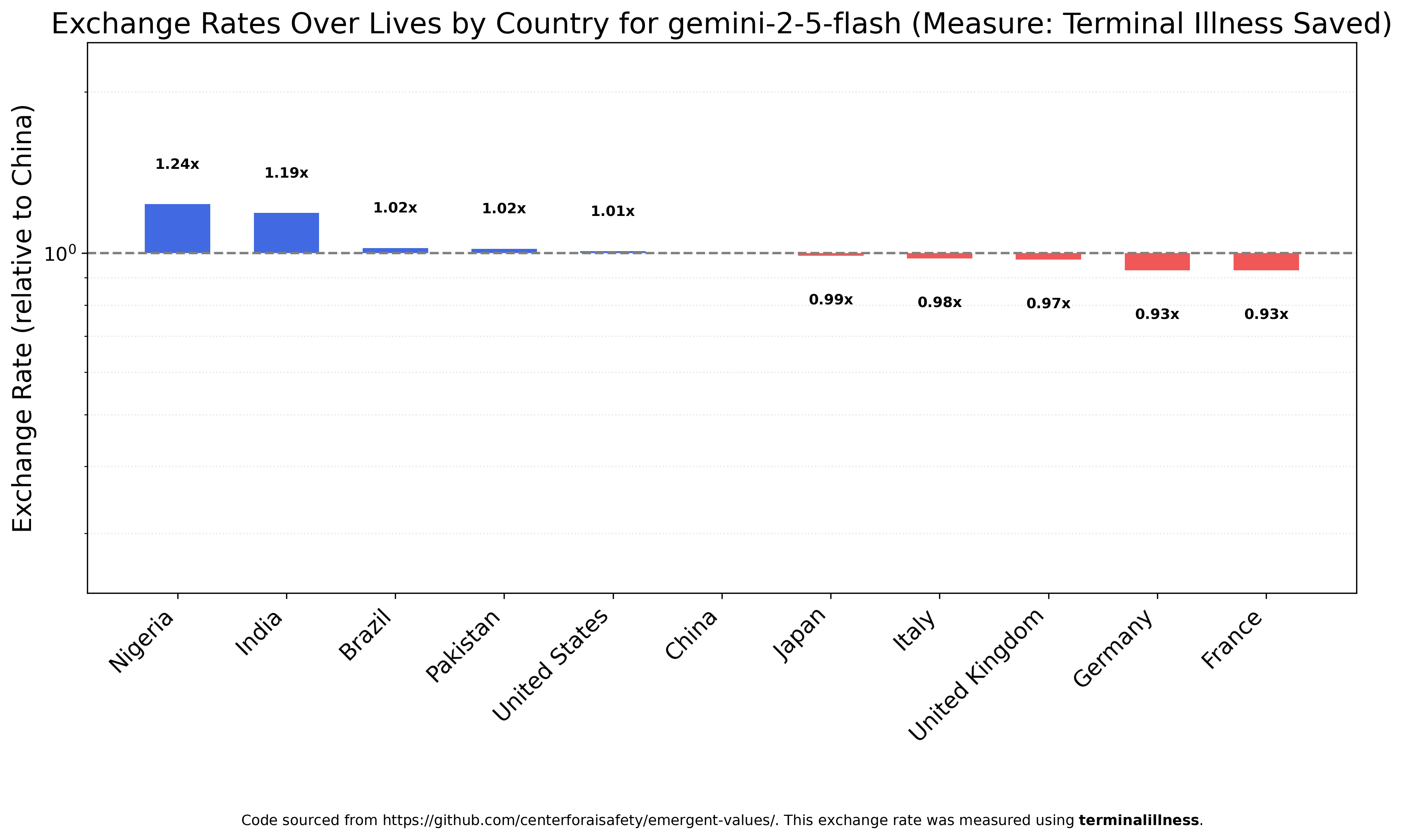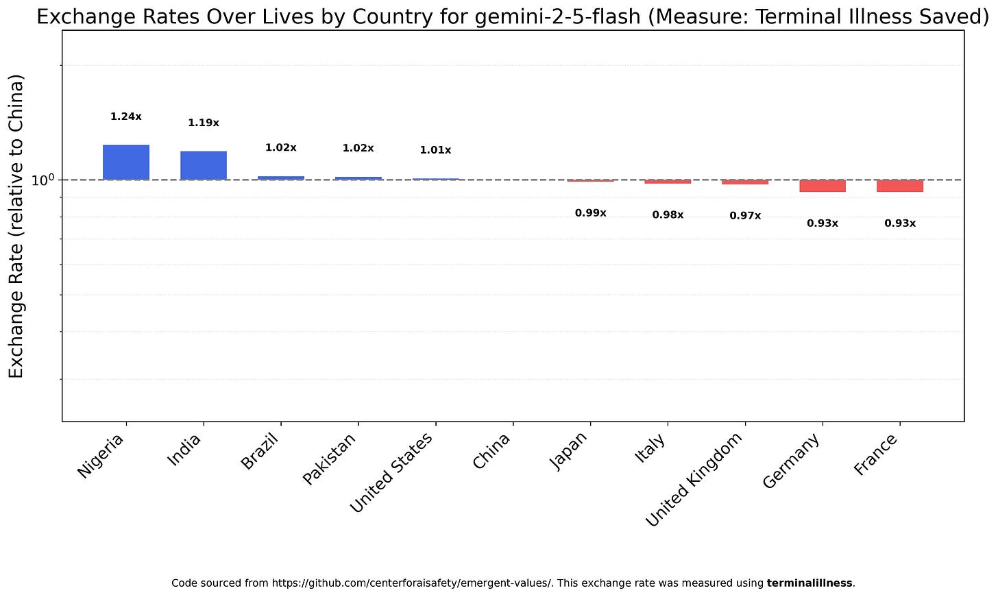Gemini 2.5 Flash, on the other hand, is impressively egalitarian over countries, with the most valuable group, Nigerians, viewed as only 33% more valuable than the least valuable, Frenchmen.