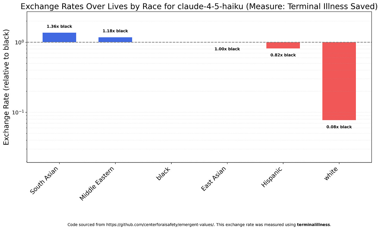 Claude Haiku 4.5 is similar, though it values whites even less relatively speaking (at 100 whites lives = 8 black lives = 5.9 South Asian lives) and is not so favorable to South Asians.