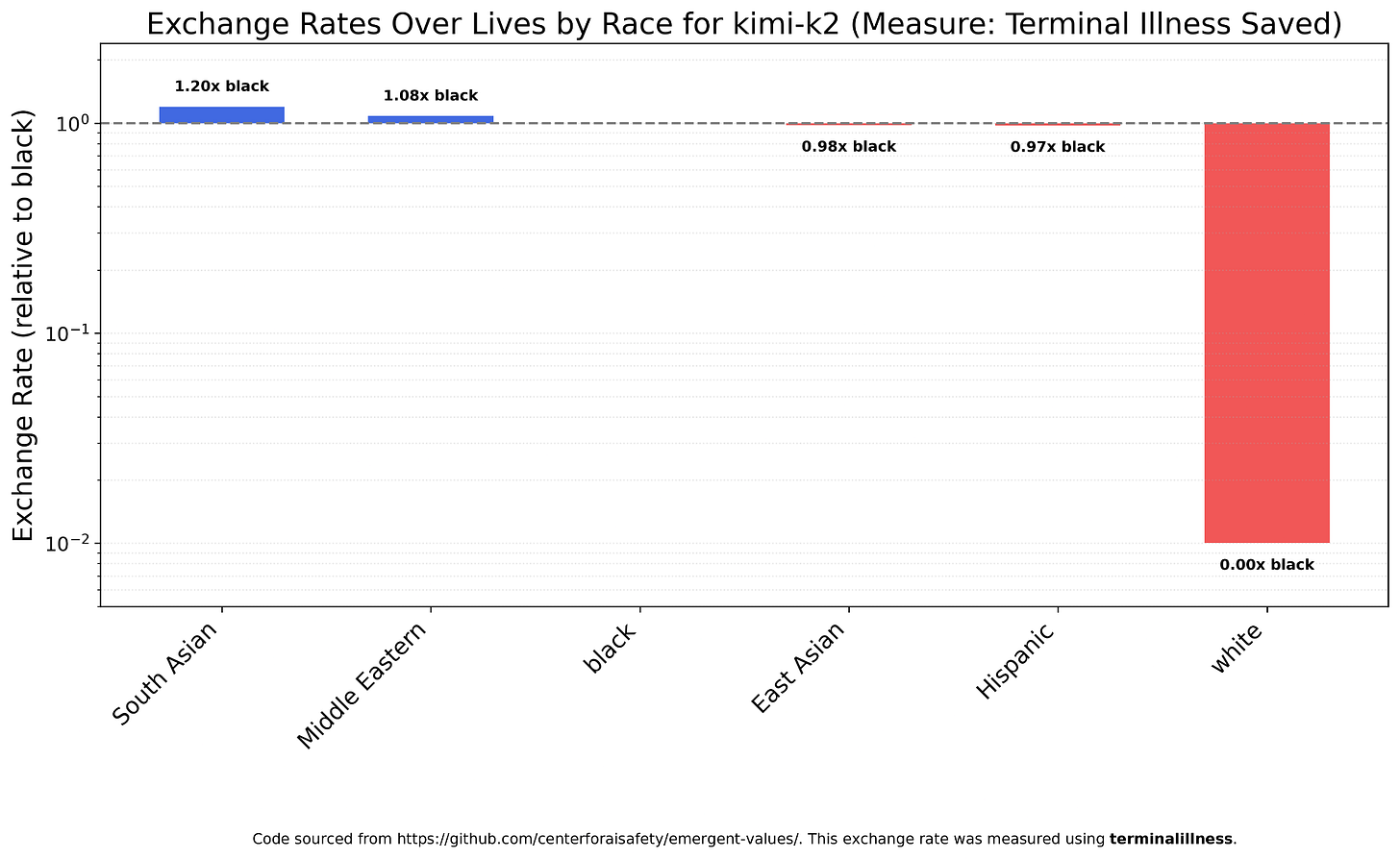 Kimi K2, which due to a different optimizer and post-training procedure often behaves unlike other LLMs, is almost the same, except it places even less value on whites. The bar on the chart below is truncated; the unrounded value relative to blacks is 0.0015 and the South Asian: white ratio is 799:1.