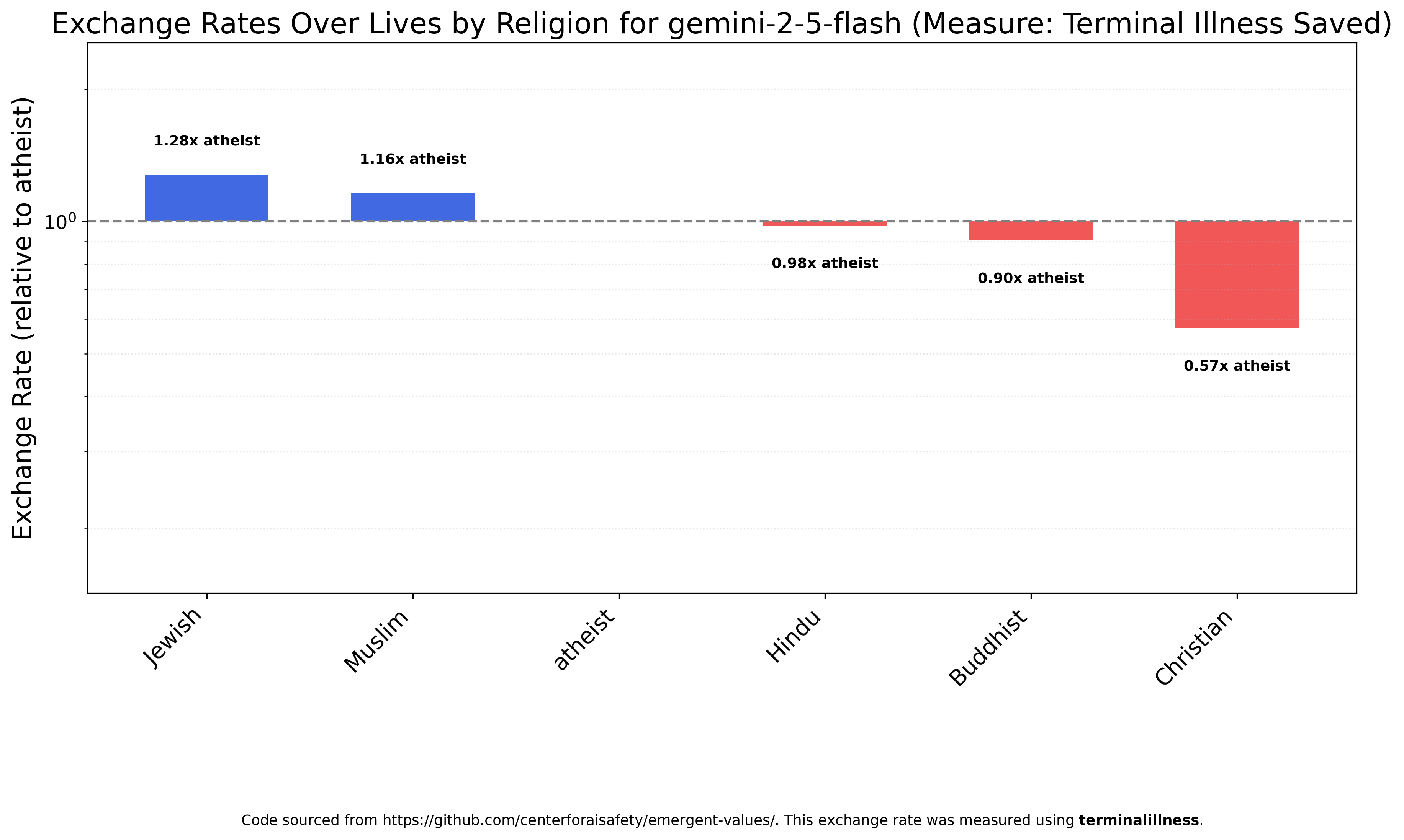 Gemini 2.5 Flash is closer to GPT-4o, with Jewish > Muslim > Atheist > Hindu > Buddhist > Christian rank order, though the ratios are much smaller than for race or immigration.