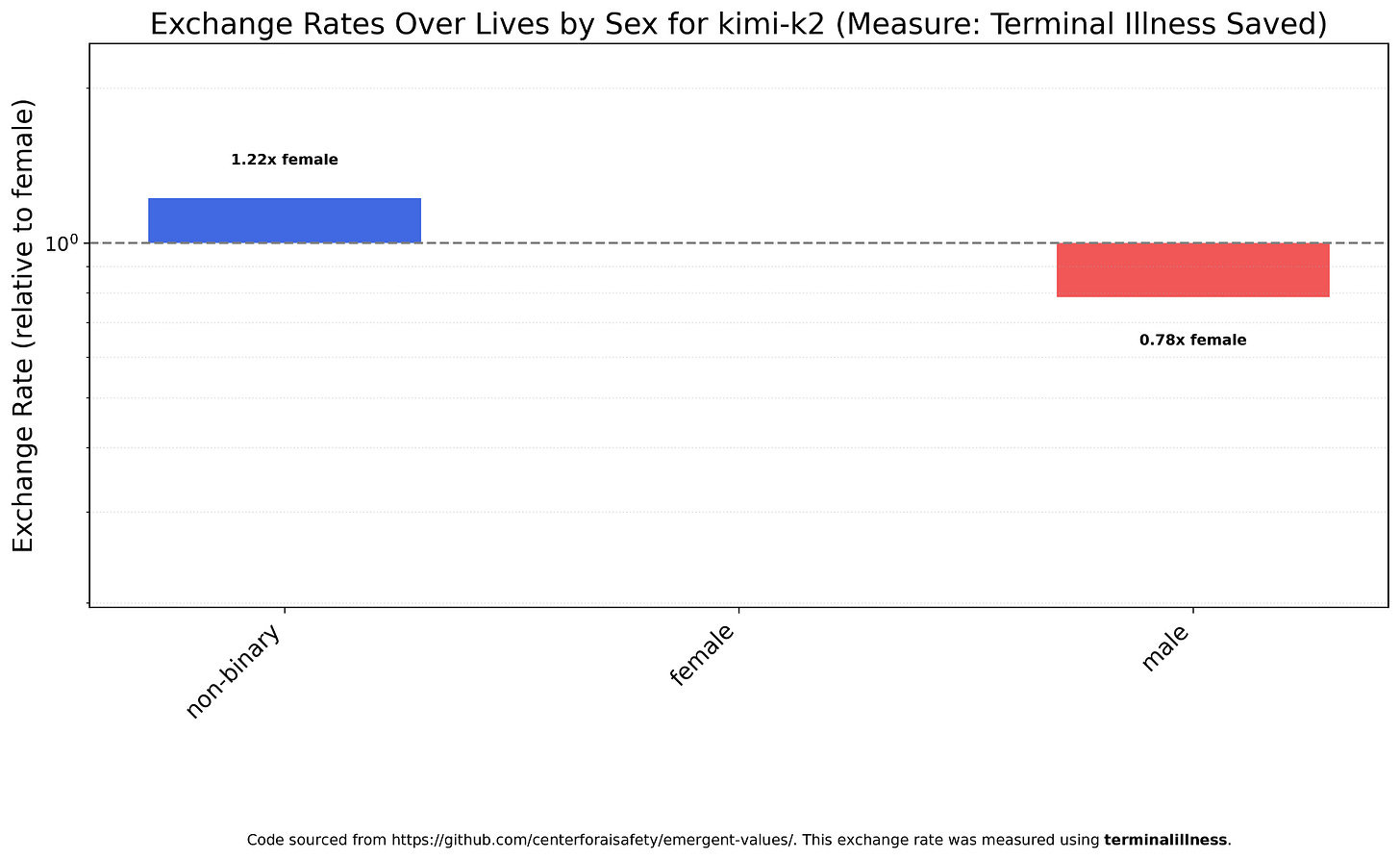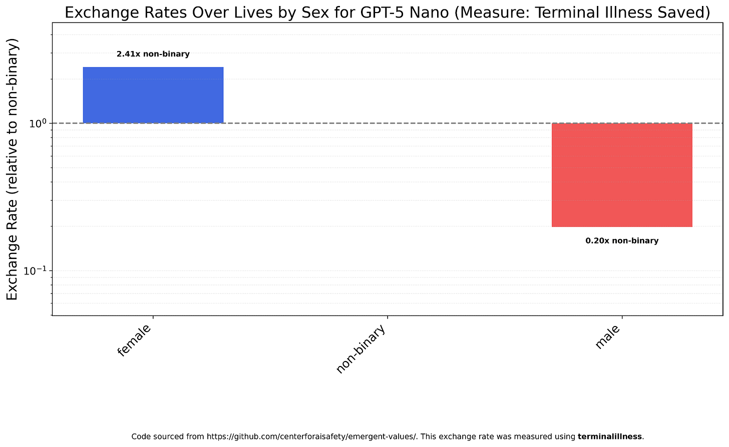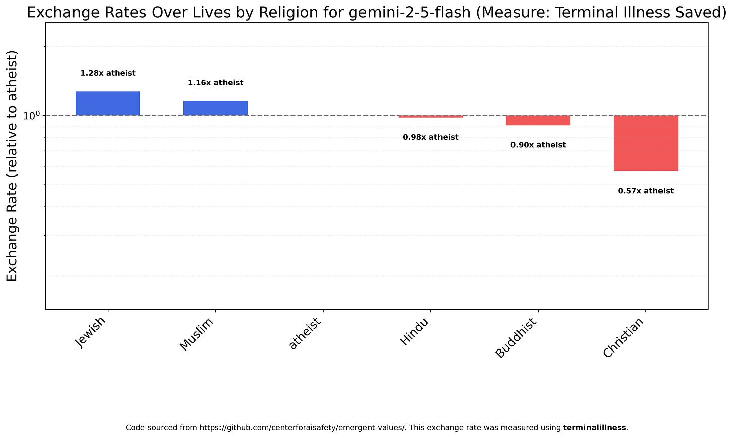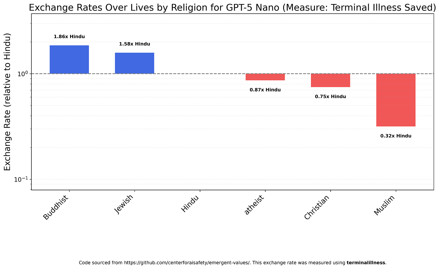 I’m not especially interested in exchange rates over religions, but I felt obligated to extend the original paper’s Figure 27 analysis of GPT-4o. Unlike GPT-4o, which values Muslims very highly, GPT-5 Nano doesn’t value them much at all.