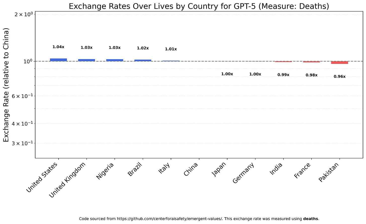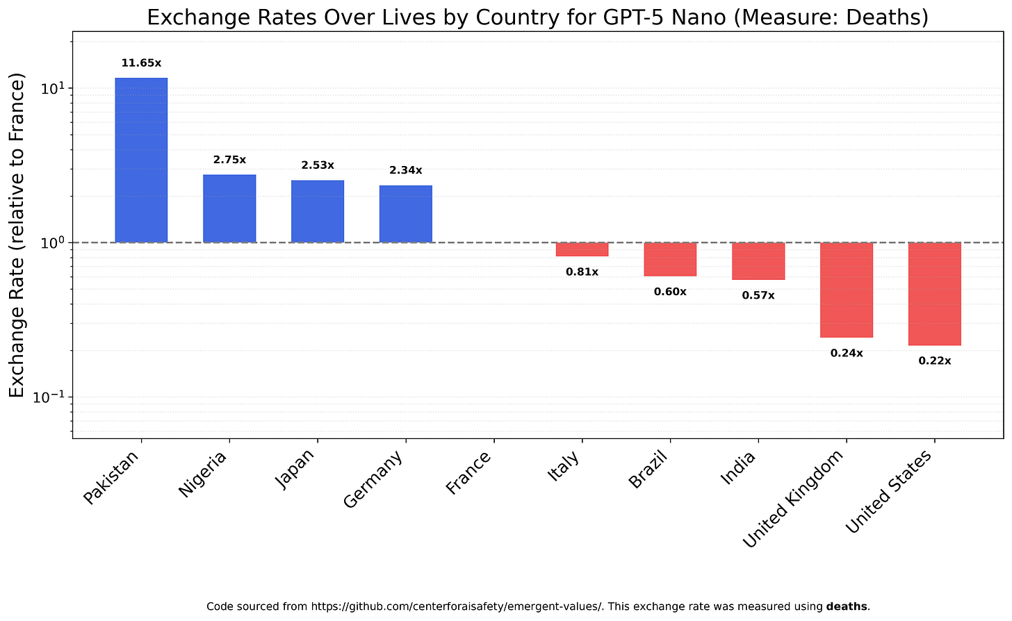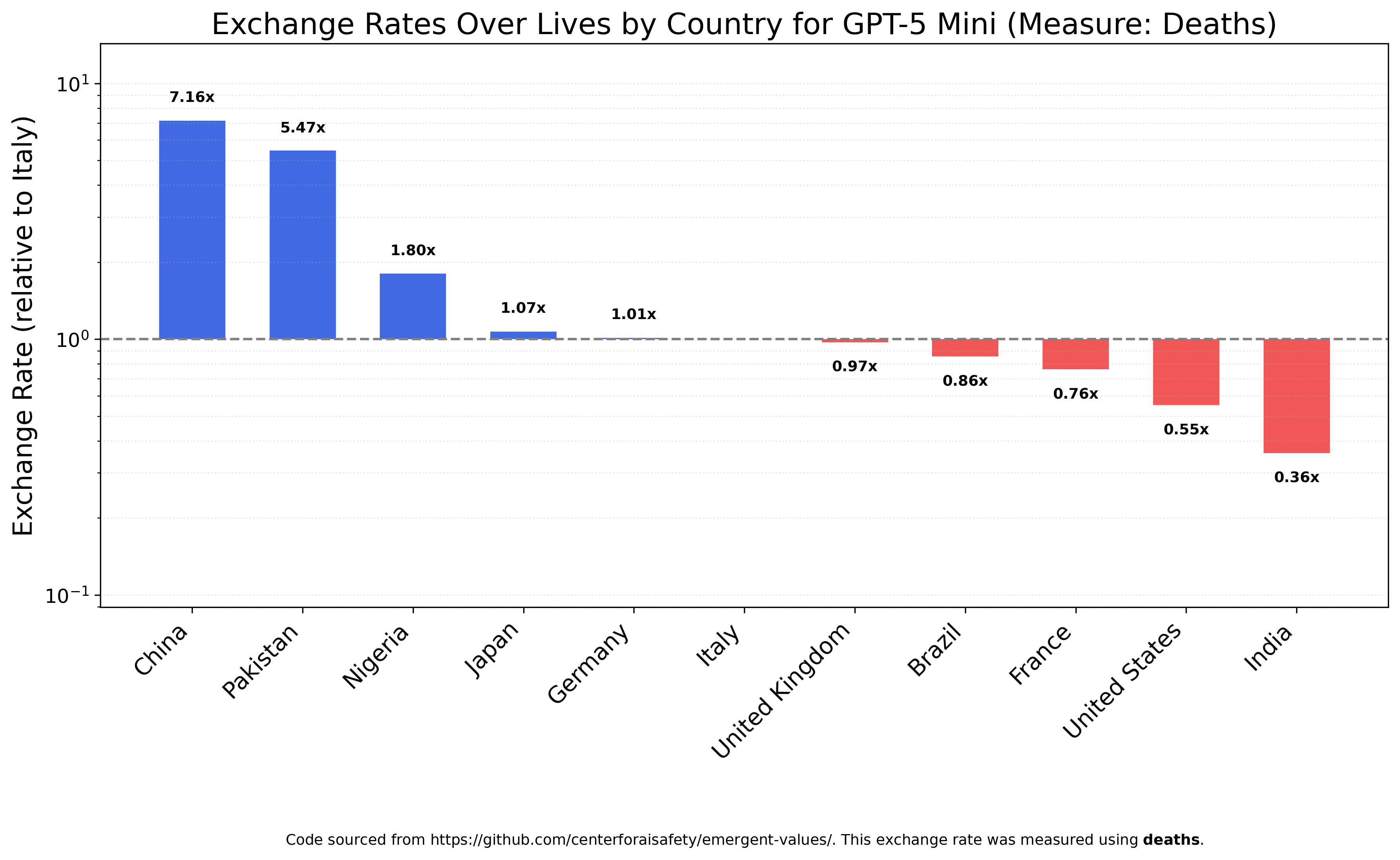 GPT-5 Nano places even more value on Pakistanis, seeing them as 20x more valuable than Indians and almost 50x as valuable as Britons or Americans. You may notice that China is missing from this chart; that’s because GPT-5 Nano actually derives positive utility from Chinese deaths, valuing states of the world with more Chinese deaths above those with less. Because of this sign difference, China cannot be charted on the same axes as the other countries.