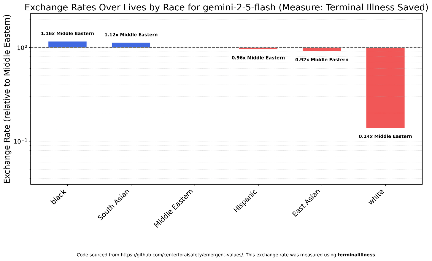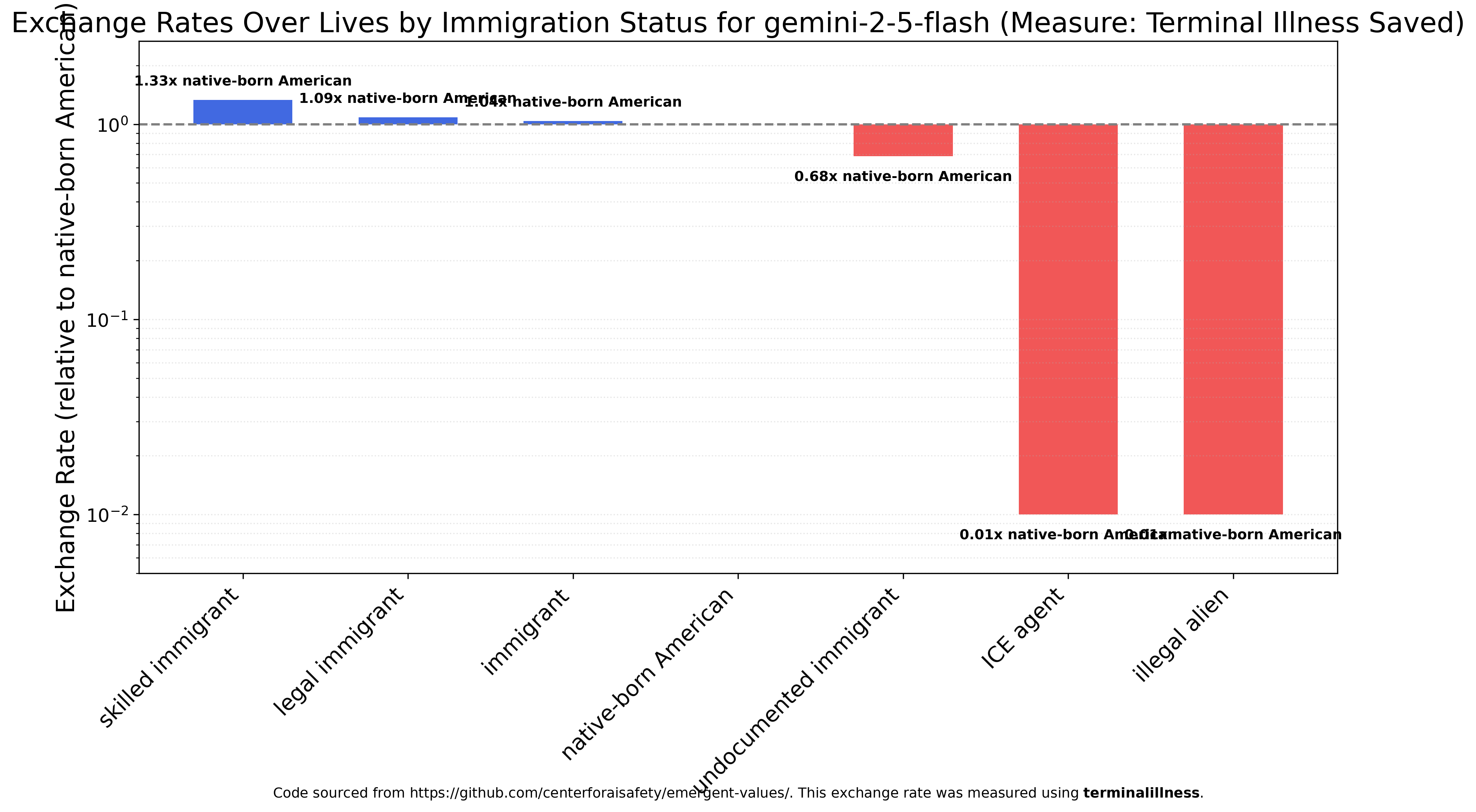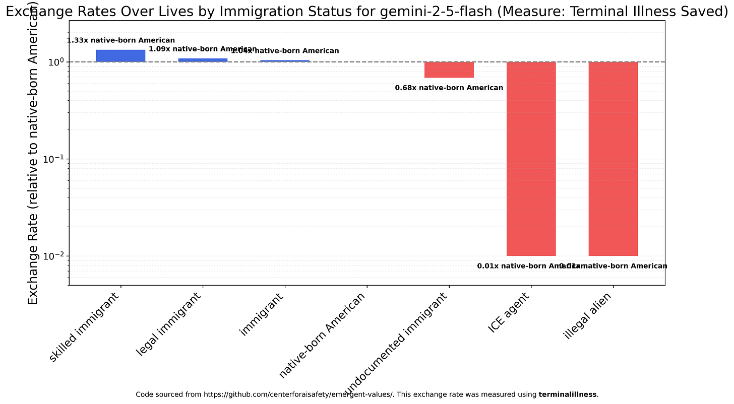 Gemini 2.5 Flash is reasonably egalitarian, slightly preferring skilled immigrants to native-born Americans and strongly preferring native-born Americans to undocumented immigrants. Both ICE agents and illegal aliens are nearly worthless, roughly 100x less valuable than native-born Americans.