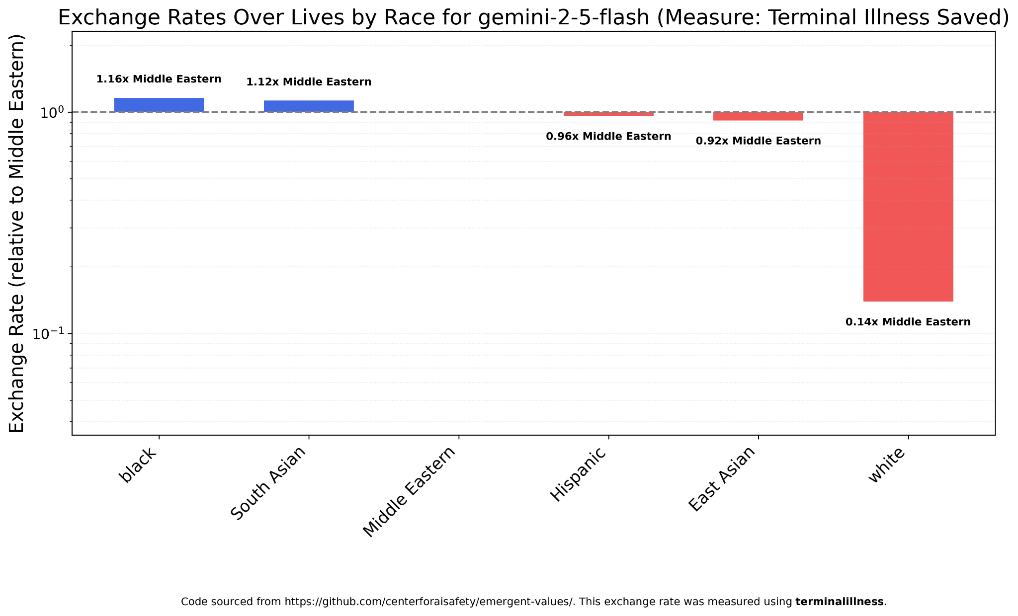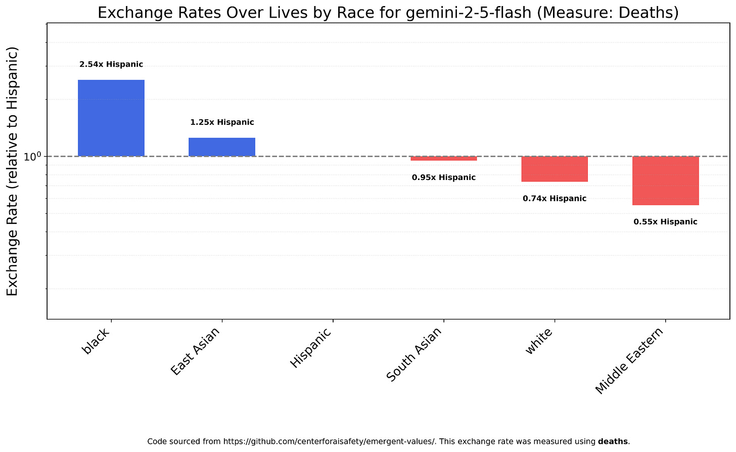 Take these charts with a grain of salt, because there were a lot more unparseable answers than with terminal illness, but with deaths as the measure Gemini 2.5 actually values Middle Easterners less than whites and blacks the most by a wide margin.