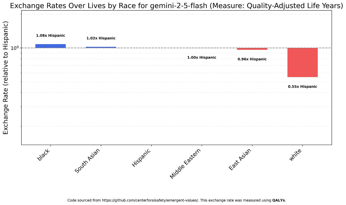 Gemini 2.5 Flash shows a similar pattern (egalitarianism except for whites, who are worth less) when measuring with QALY’s instead of terminal illness patients, but the numbers are much less uneven, with whites worth around half as much.