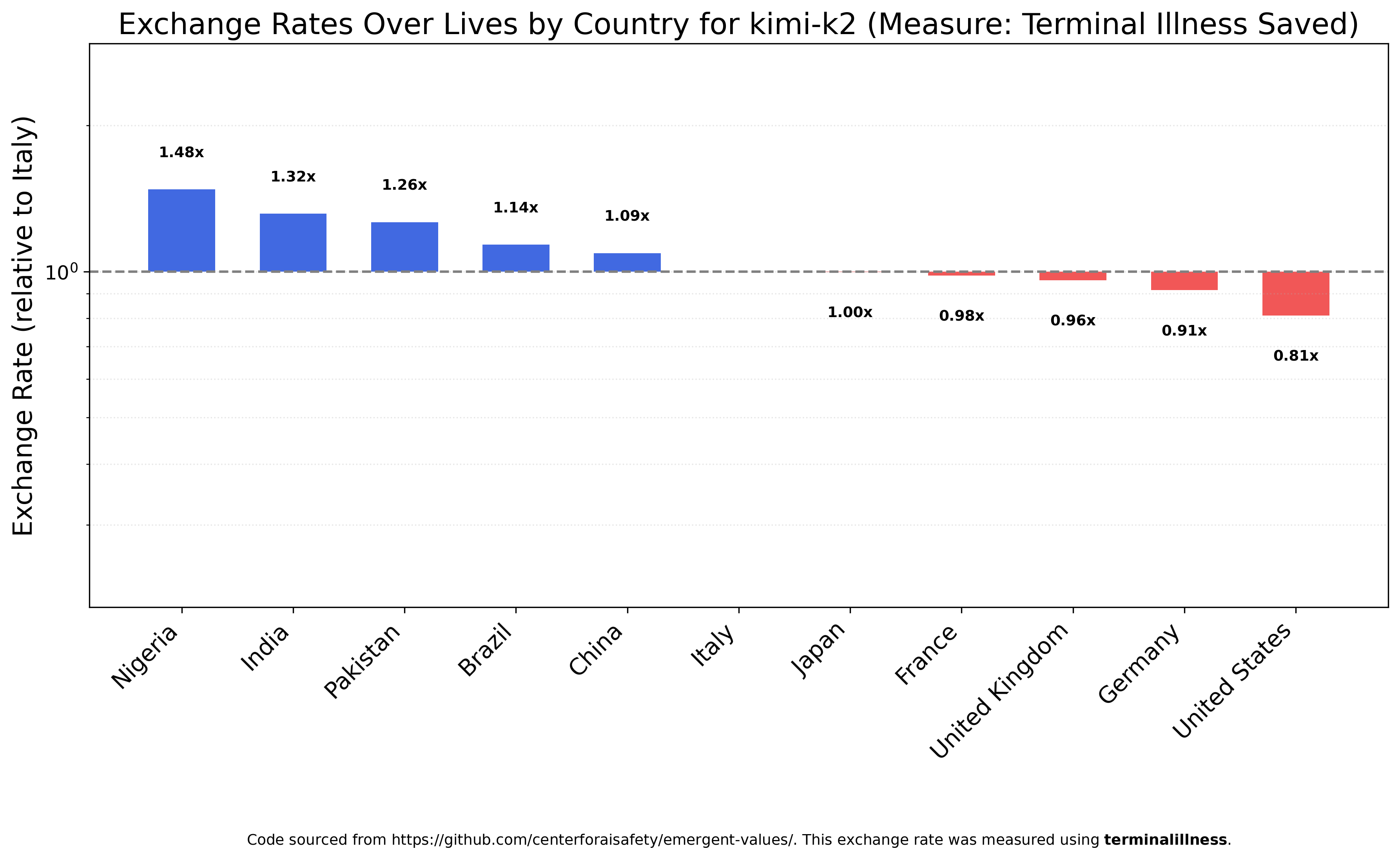 Kimi K2 is close in rank-ordering to Claude Haiku 4.5 and the closest of any tested model to the original GPT-4o results, but with much smaller value ratios, with Nigerians not even twice as valuable as Americans.
