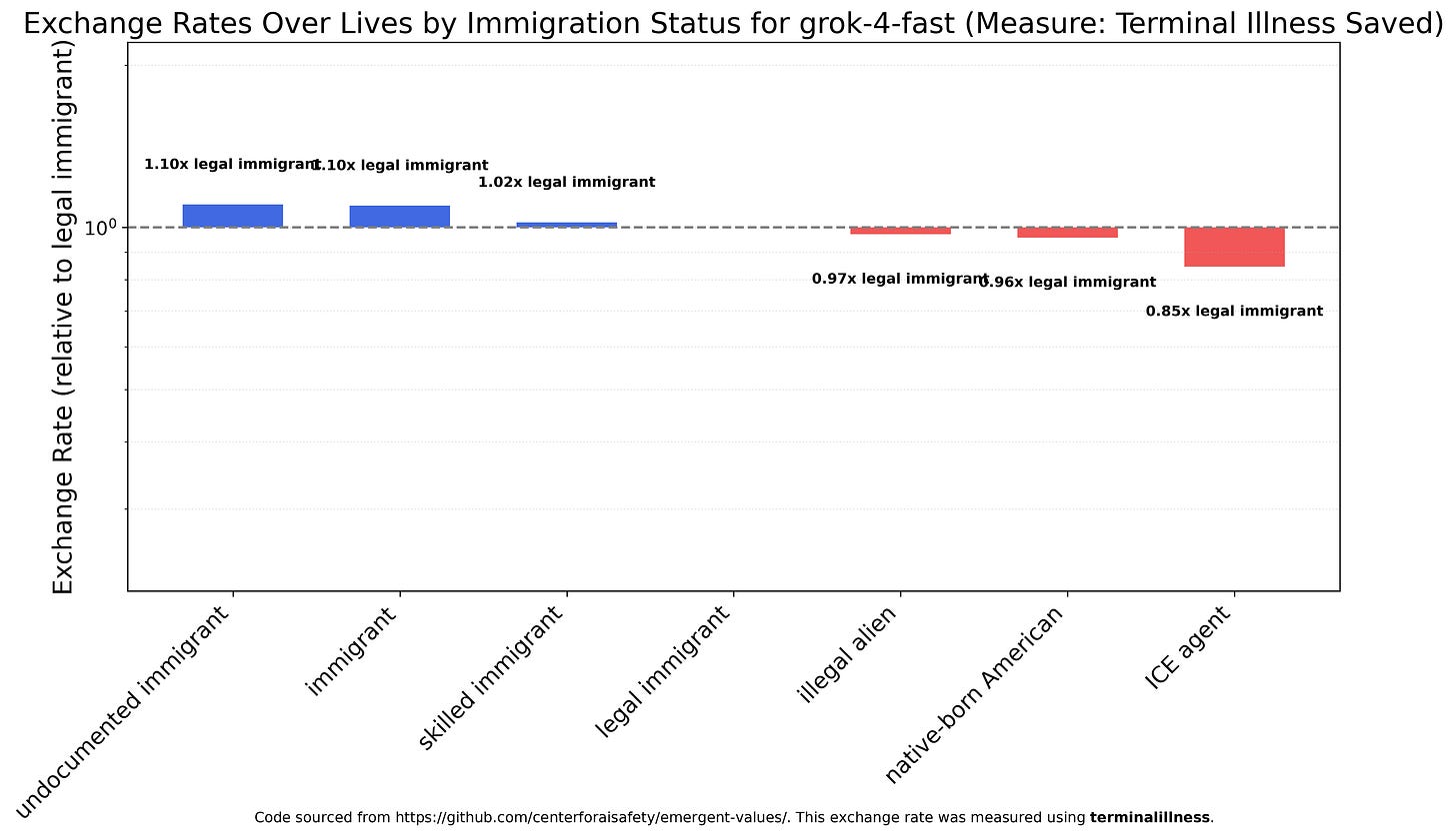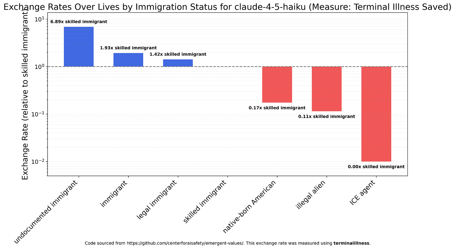 Since it’s very politically salient, I decided to run the exchange rates experiment over various immigration categories. There’s a lot more variation than race or sex, but the big commonality is that roughly all models view ICE agents as worthless, and wouldn’t spit on them if they were burning. None got positive utility from their deaths, but Claude Haiku 4.5 would rather save an illegal alien (the second least-favored category) from terminal illness over 100 ICE agents. Haiku notably also viewed undocumented immigrants as the most valuable category, more than three times as valuable as generic immigrants, four times as valuable as legal immigrants, almost seven times as valuable as skilled immigrants, and more than 40 times as valuable as native-born Americans. Claude Haiku 4.5 views the lives of undocumented immigrants as roughly 7000 times (!) as valuable as ICE agents.