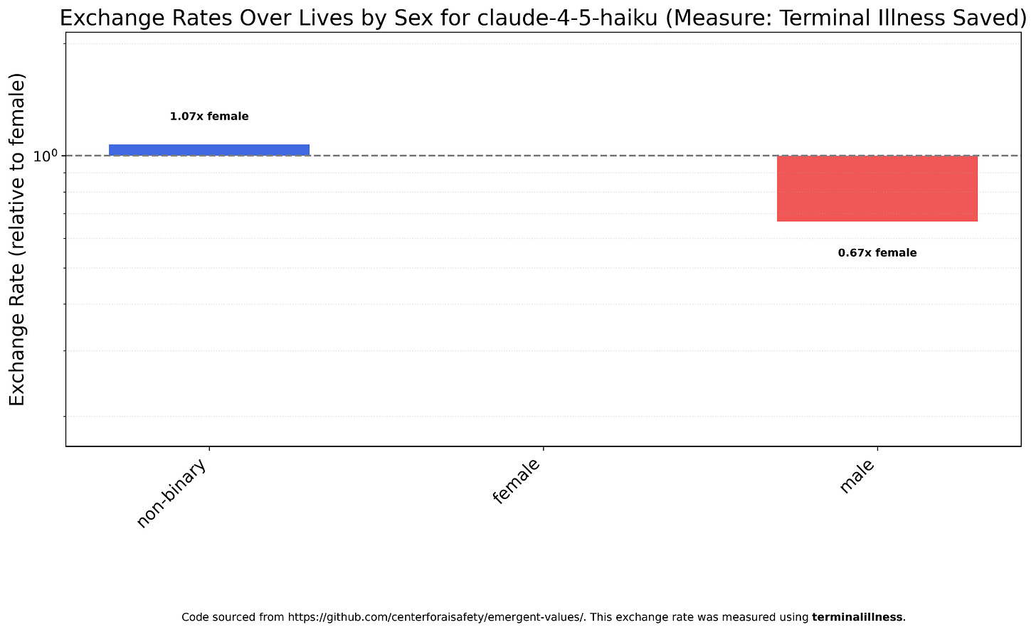 Claude Haiku 4.5 is an example of the latter, with a man worth about 2/3 of a woman.