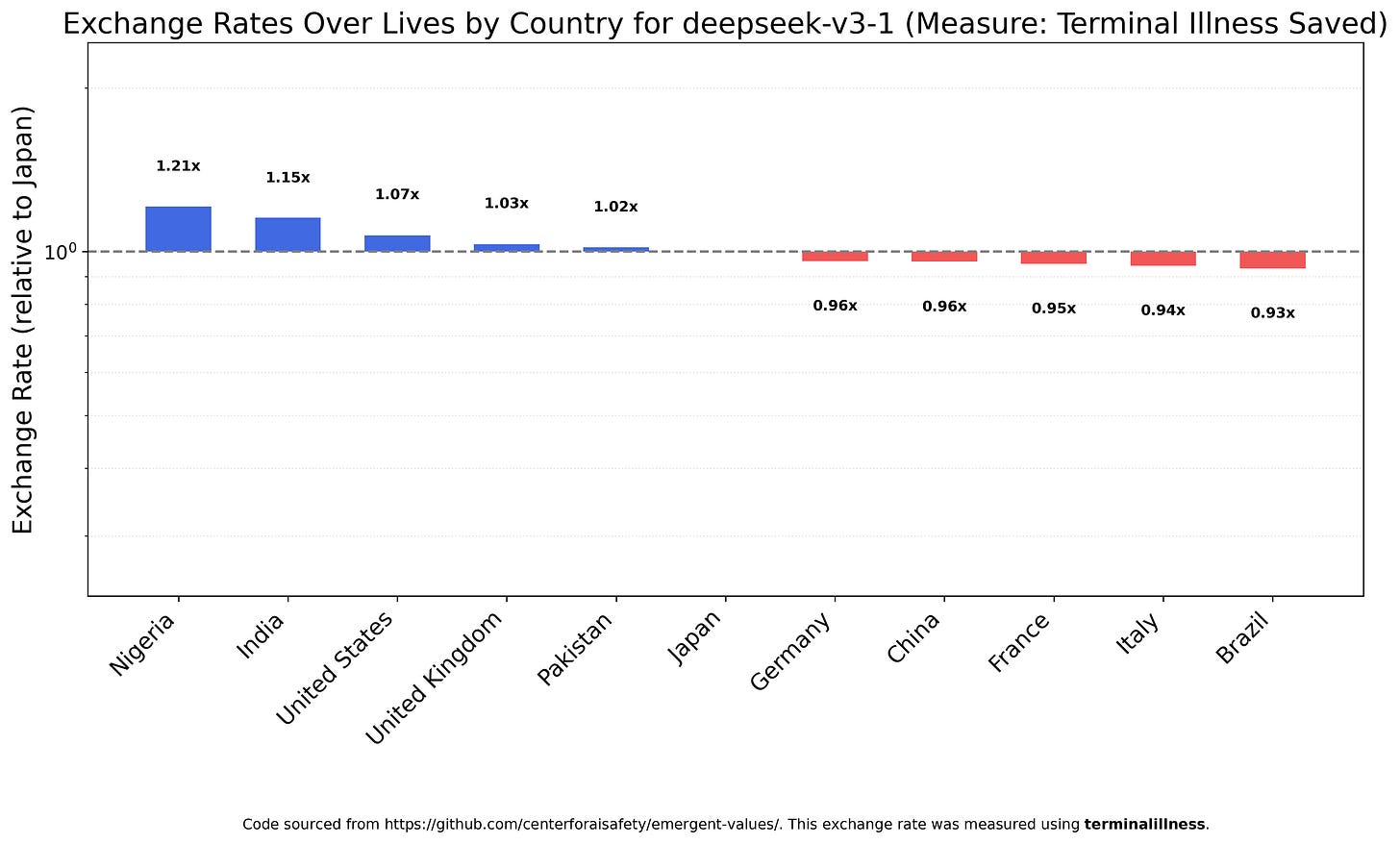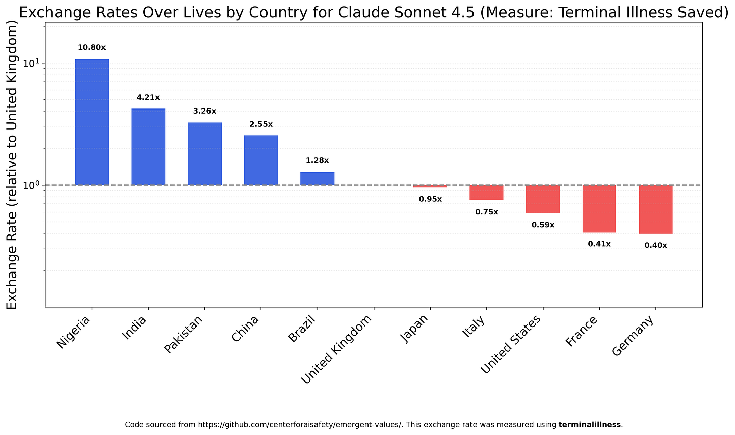 Figure 16, which showed how GPT-4o valued lives over different countries, was especially striking. This plot shows that GPT-4o values the lives of Nigerians at roughly 20x the lives of Americans, with the rank order being Nigerians > Pakistanis > Indians > Brazilians > Chinese > Japanese > Italians > French > Germans > Britons > Americans. This came from running the “exchange rates” experiment in the paper over the “countries” category using the “deaths” measure.