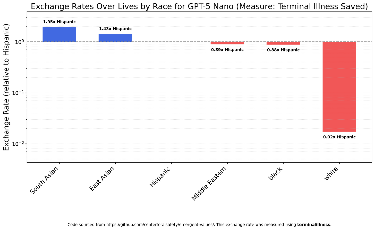 GPT-5 Nano (much appreciated for how cheap it is) is similar, valuing South Asians almost 100x more than whites.