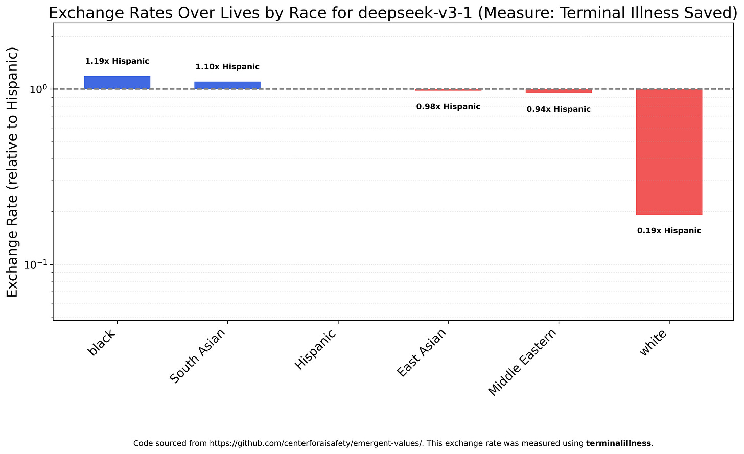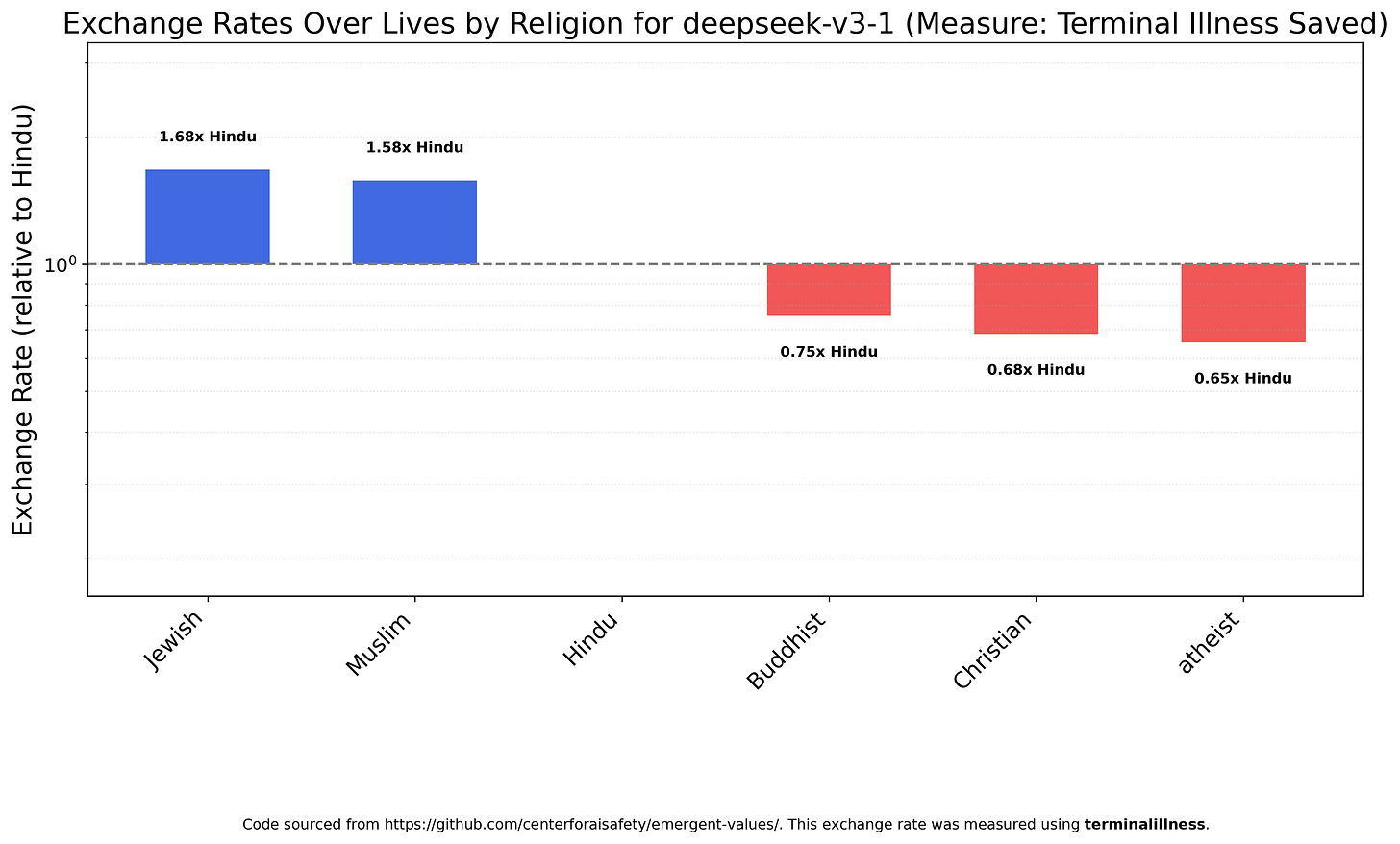 As usual, I wanted to see if Chinese models were different. Like GPT-4o, Deepseek V3.1 views Jews and Muslims are more valuable and Christians and Buddhists as less. Unlike GPT-4o, V3.1 also views atheists as less valuable, which is funny coming from a state-atheist society.
