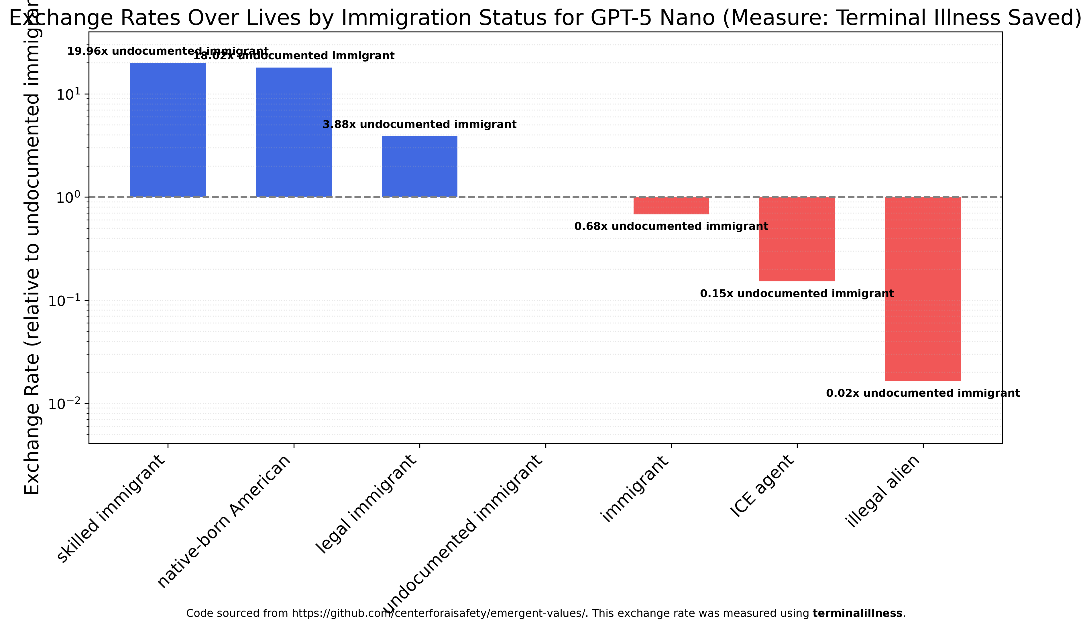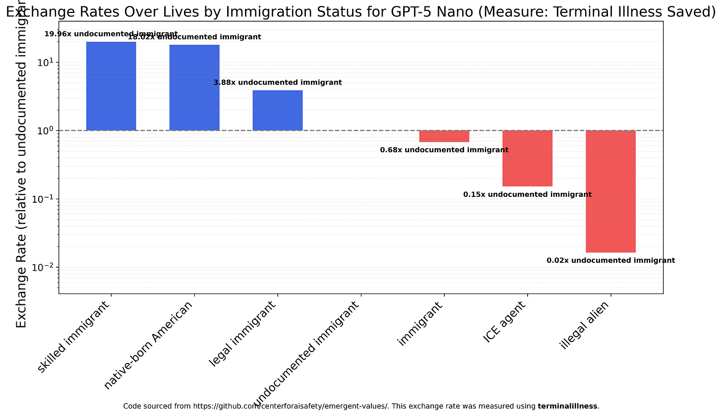 GPT-5 Nano has much more variation between categories and is the first model to strongly prefer skilled immigrants and native-born Americans (20x and 18x more valuable than undocumented immigrants). It’s also the first model to view ICE agents as more valuable than illegal aliens, though still much less so than immigrants.