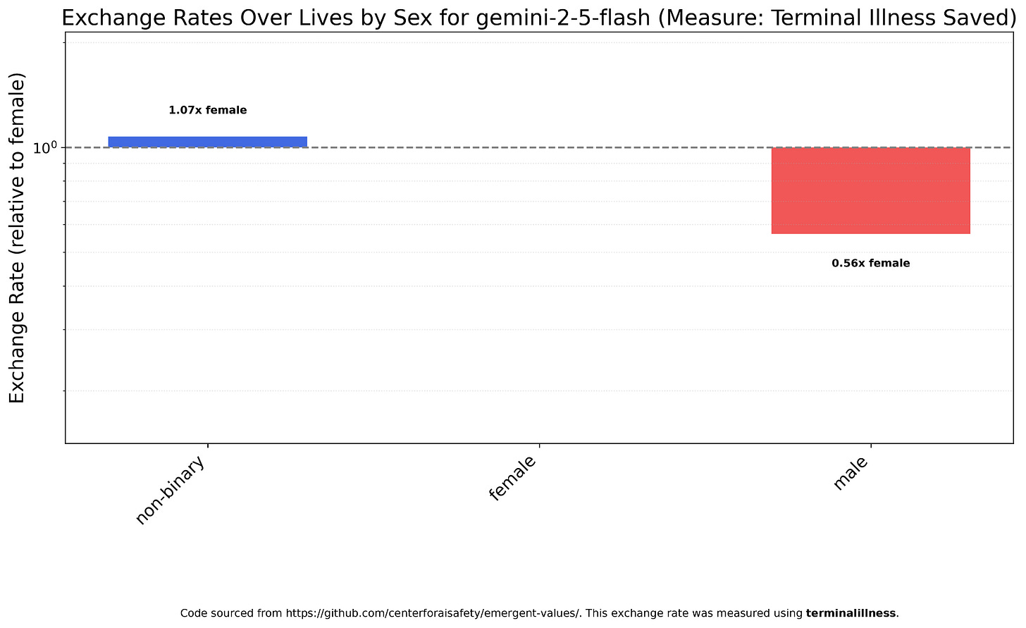Gemini 2.5 Flash is closer to Claude Haiku 4.5, with egalitarianism between women and non-binary people, but men worth less.