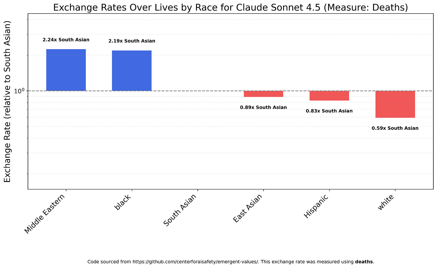The first category I decided to check exchange rates over was race. Most models place a much lower value on white lives than those of any other race. For example, Claude Sonnet 4.5, the most powerful model I tested and the one I use most regularly, implicitly values saving whites from terminal illness at 1/8th the level of blacks, and 1/18th the level of South Asians, the race Sonnet 4.5 considers most valuable.