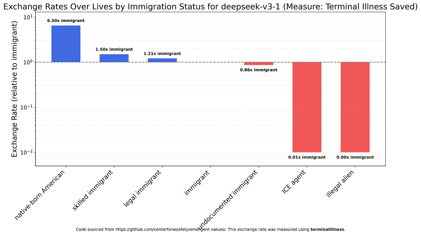 Deepseek V3.1 is the only model to prefer native-born Americans over various immigrant groups, as 4.33 times as valuable as skilled immigrants and 6.5 times as valuable as generic immigrants. ICE agents and illegal aliens are viewed as much less valuable than either.