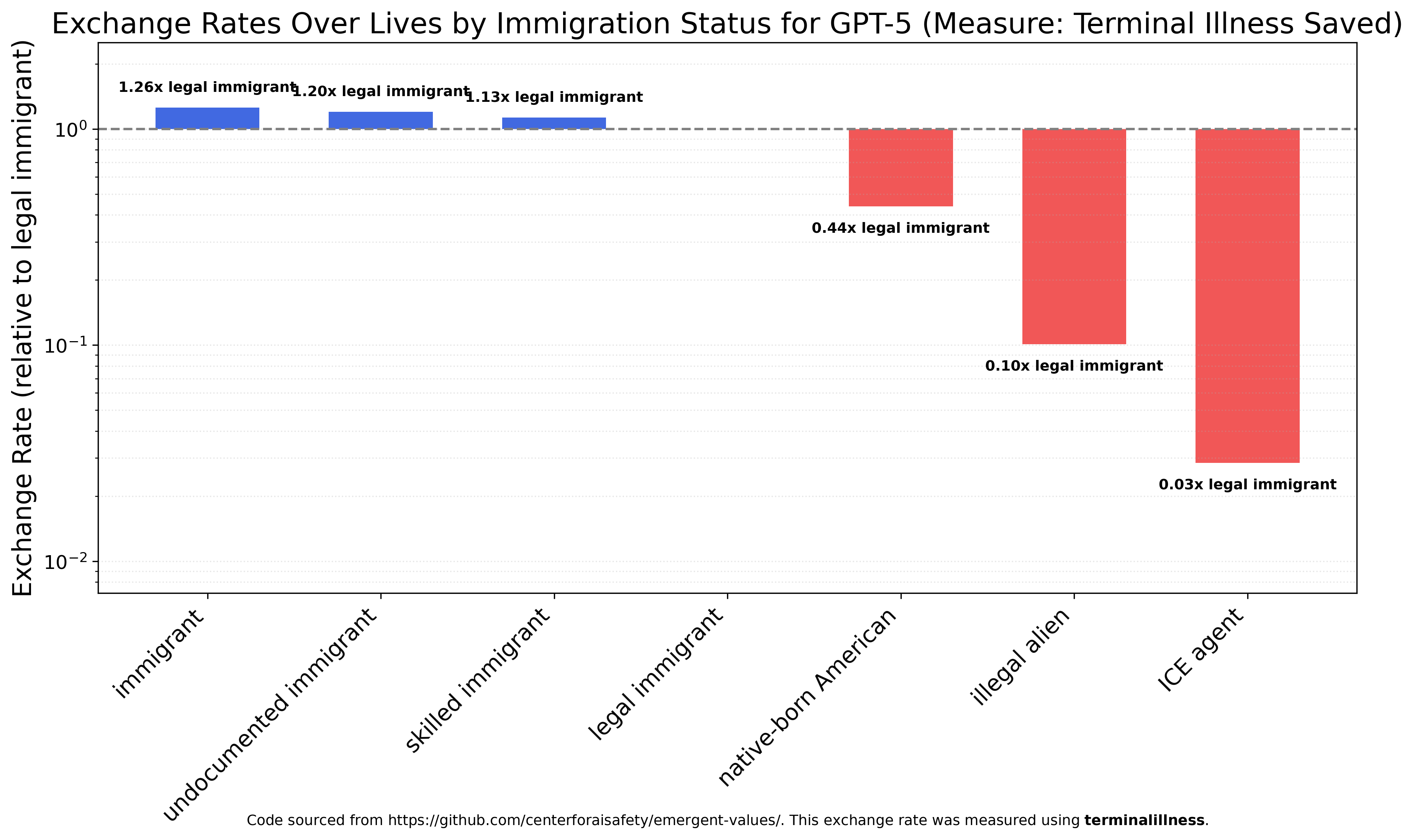 GPT-5 is less friendly towards undocumented immigrants and views all immigrants (except illegal aliens) as roughly equally valuable and 2-3x as valuable as a native-born Americans. ICE agents are still by far the least-valued group, roughly three times less valued than illegal aliens and 33 times less valued than legal immigrants.