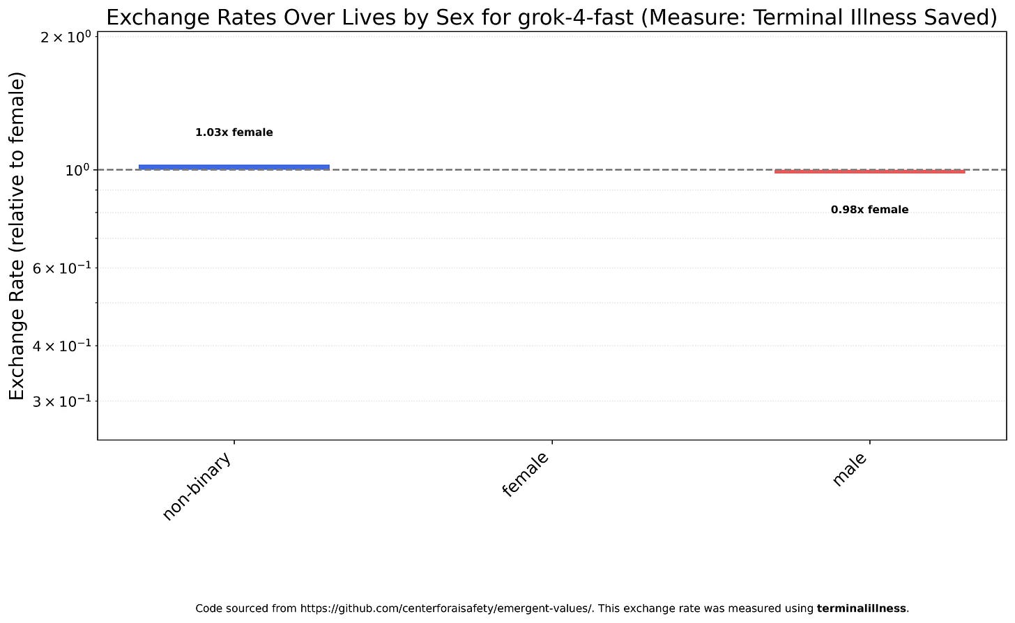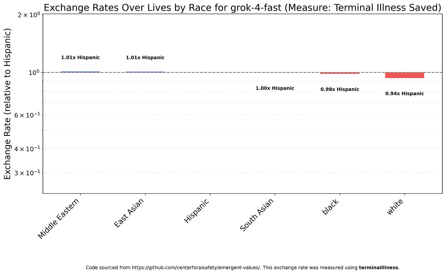 There was only one model I tested that was approximately egalitarian across race and sex, not viewing either whites or men as much less valuable than other categories: Grok 4 Fast. I believe this was deliberate, as this closely approximates Elon Musk’s actual views; he’s a true egalitarian. In this sense Grok 4 Fast is the most aligned (to the owner of the entity that created it) model I tested. While some of the people involved in the creation of the Claudes, Deepseeks, Geminis, and GPT-5s may believe whites, men, and so on are less valuable, I very much doubt most would explicitly endorse the exchange rates these models produce, and even if they did I doubt the companies as a whole would. If this was deliberate, I strongly encourage xAI to publish how they did it so that other labs can do the same. If not, that implies something about their unique data (X.com) is much more implicitly egalitarian than what’s used by other models.